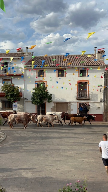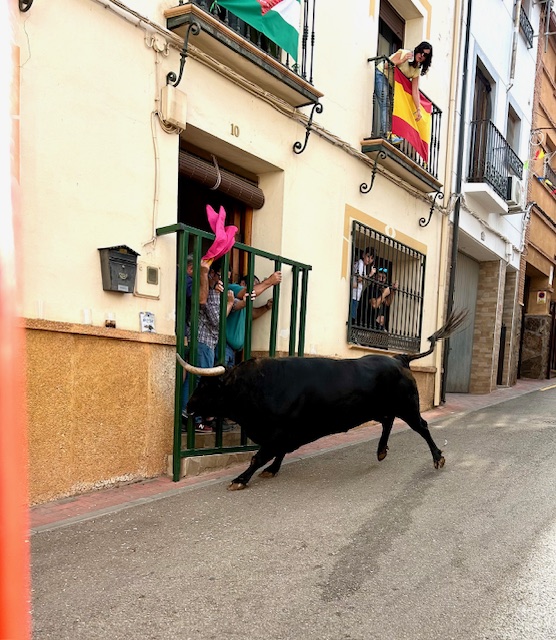 Wat luide knallen geven aan dat er iets staat te gebeuren… En ja, een groepje jonge stieren is nu los in het dorp. Steeds meer volk raakt opgewonden en velen gaan uiteindelijk uit hun dak om dit groepje hoe dan ook uit te dagen en door het dorp te jagen. Na enige tijd gaan de hekken weer open en wandelen naar een zijstraat. Totdat…, ja hoor nieuwe knal, hekken dicht en ronde twee begint. Wat we zien is een in onze ogen volledig losgeslagen menigte en een traditie waar wij met ons gezond verstand niet bij kunnen. Men doet er werkelijk alles aan om de stieren doldriest te krijgen en laat niets onbenut.